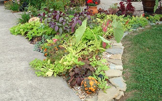 The photo below shows the combination of green and purple colored foliage in my front yard landscape. See the subtle addition of a single bumpy gourd in the corner.